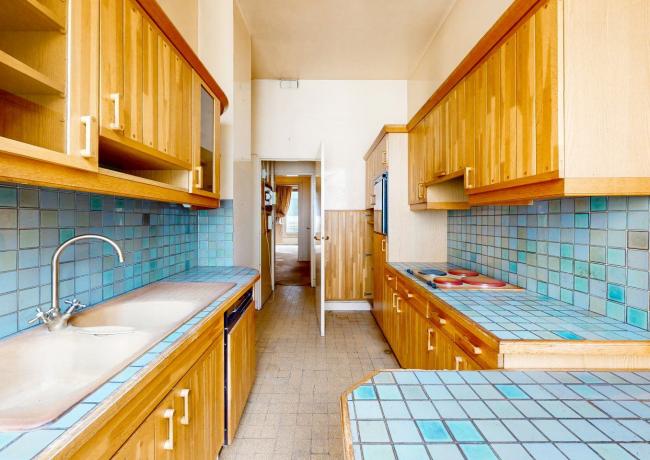 Au 2e étage : entrée, grand séjour, chambre, cuisine, salle de bains, wc. Travaux à prévoir.