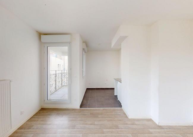 séjour avec coin cuisine et balcon, wc, salle de bains,
