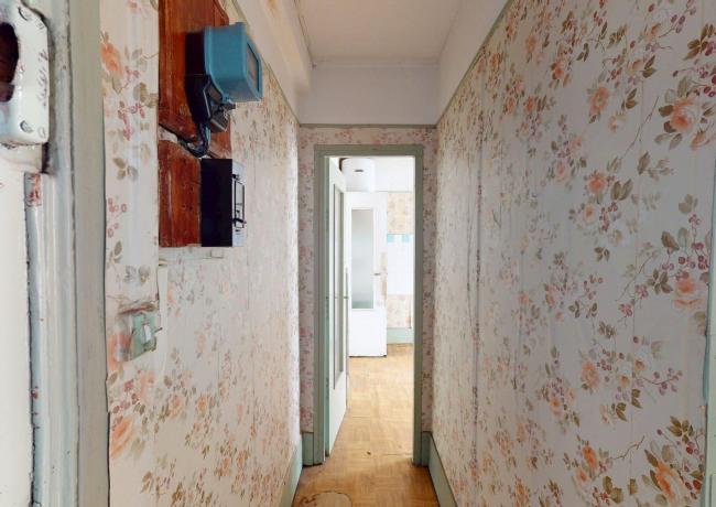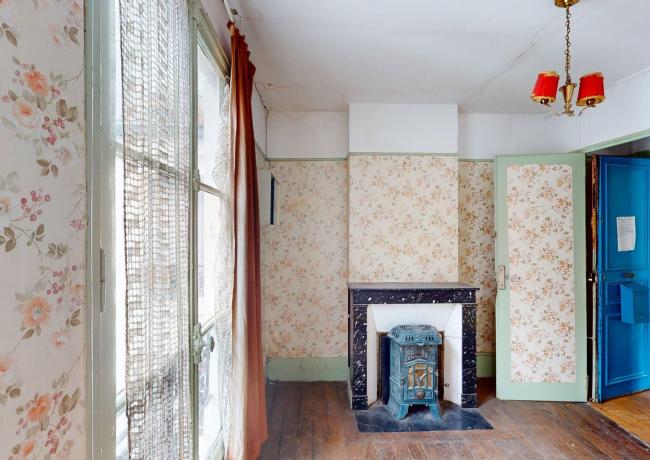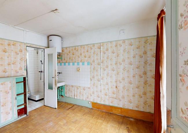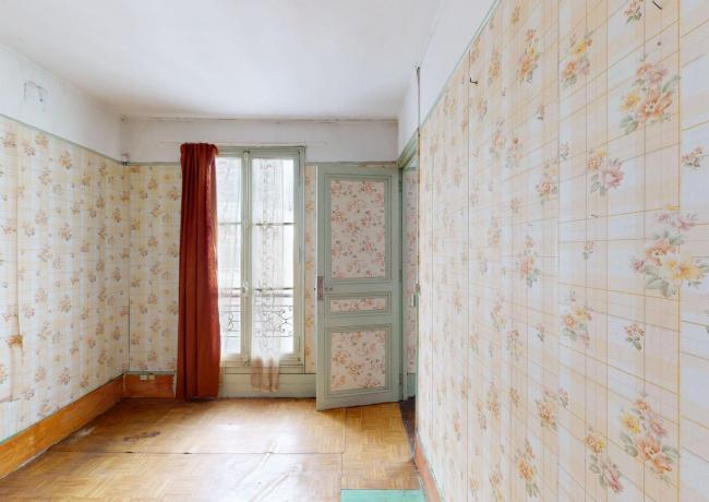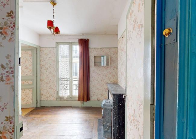 Escalier B, sur cour, au 5e étage : entrée, salon, chambre, cuisine, salle d'eau avec, wc. Travaux à prévoir.
