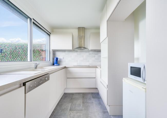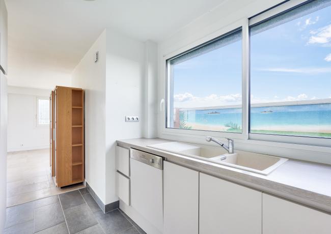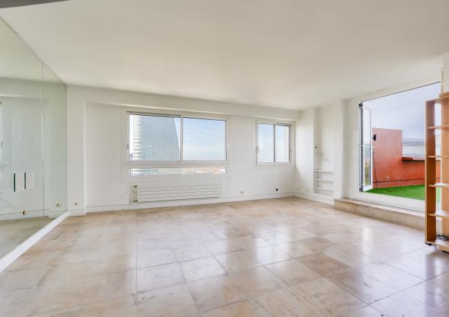 Au 33e étage, entrée sur séjour de 30m², agrémenté d'une cuisine semi-ouverte, moderne et équipée de 8m².