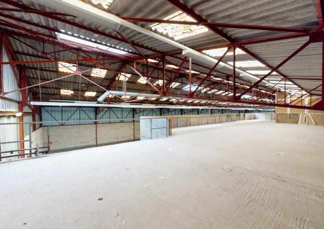 En mezzanine : Stockage léger (ouvert sur la partie activités, éclairage zénithal par plaques translucides, deux escaliers métalliques vers la partie activités en contrebas, encombrement par des poutrelles métalliques à moins de 1,8 mètre de hauteur).