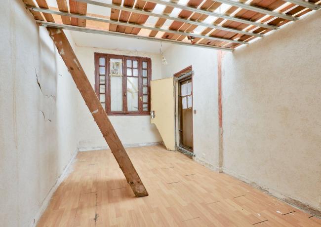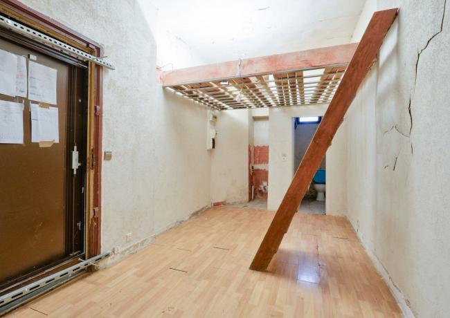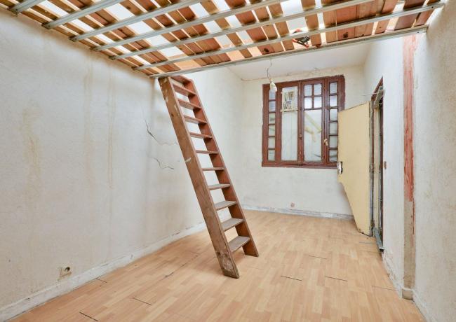 En rez-de-chaussée du bâtiment, première porte à droite : une pièce comprenant un espace mezzanine destiné au couchage, un recoin à aménager en cuisine, un wc avec fenêtre et une cabine de douche.
